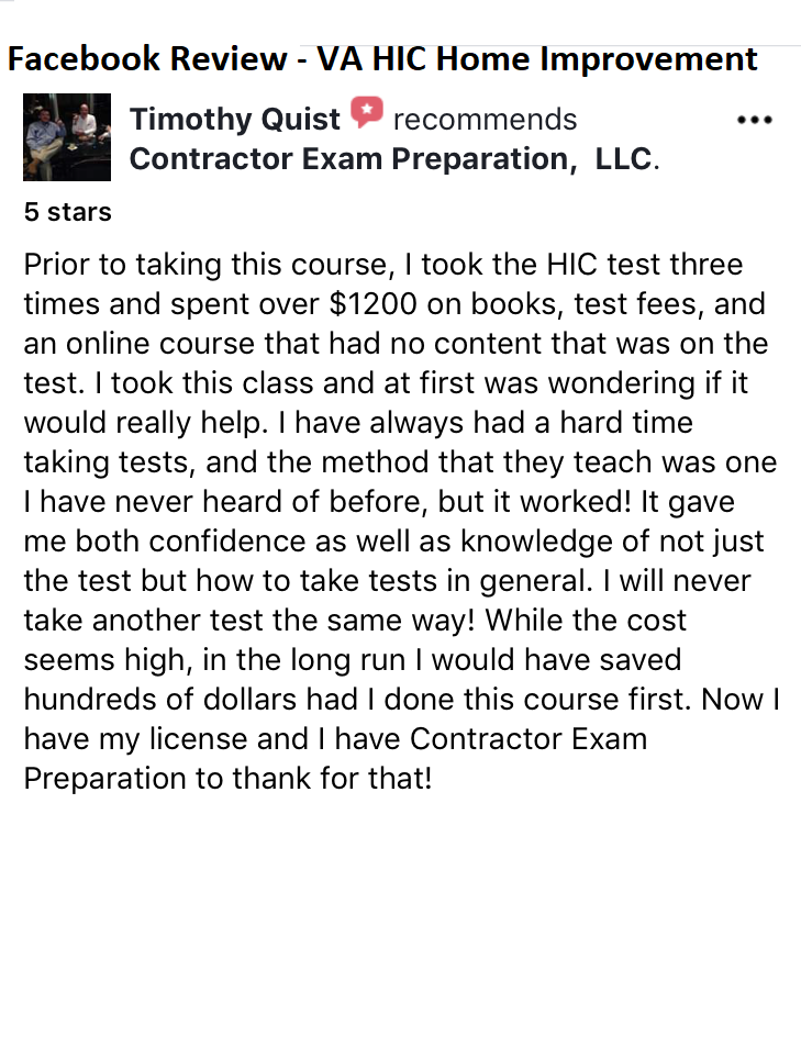Prepare you to pass the Virginia Home Improvement Contracting (HIC) Specialty exam ... The First Time ... GUARANTEED!